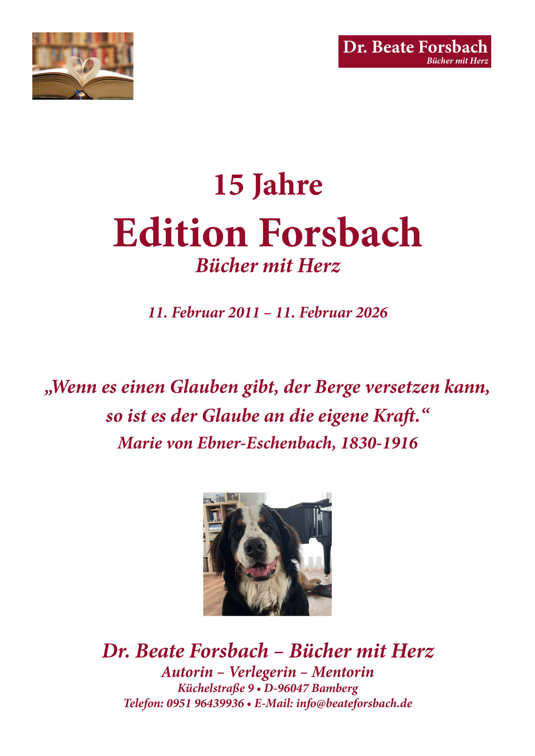 Denn mein Motto lautet: „Wenn es einen Glauben gibt, der Berge versetzen kann, so ist es der Glaube an die eigene Kraft.“ Dieser Spruch von Marie von Ebner-Eschenbach leitet mich seit dem 10jährigen Verlagsjubiläum vor 5 Jahren.